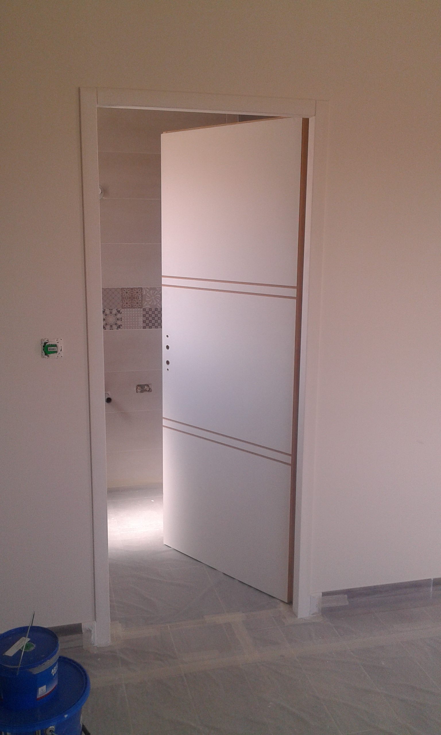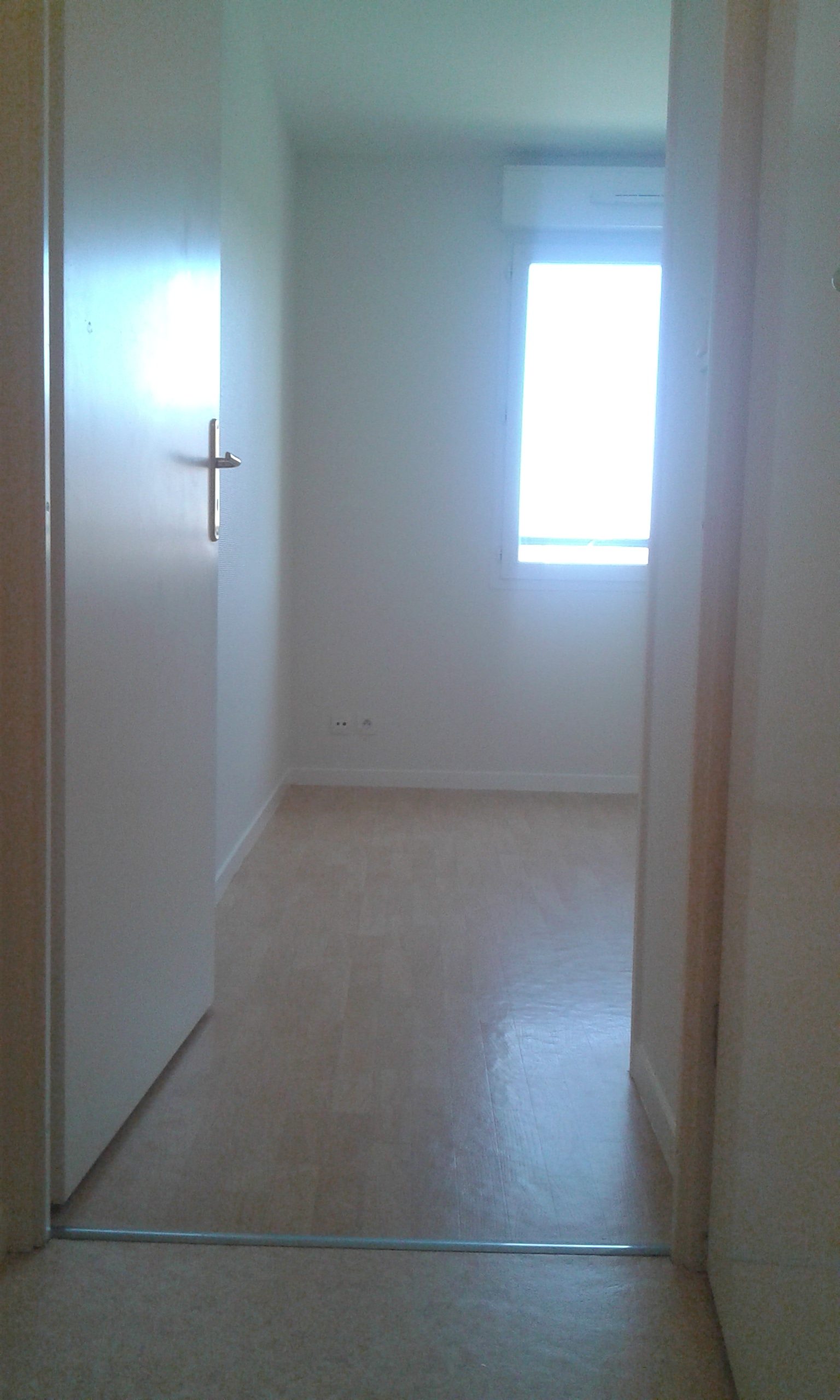 Cadre de porte repeint à l’aide d’une peinture à l’huile satin tendu. Au sol, lames de PVC imitation parquet.