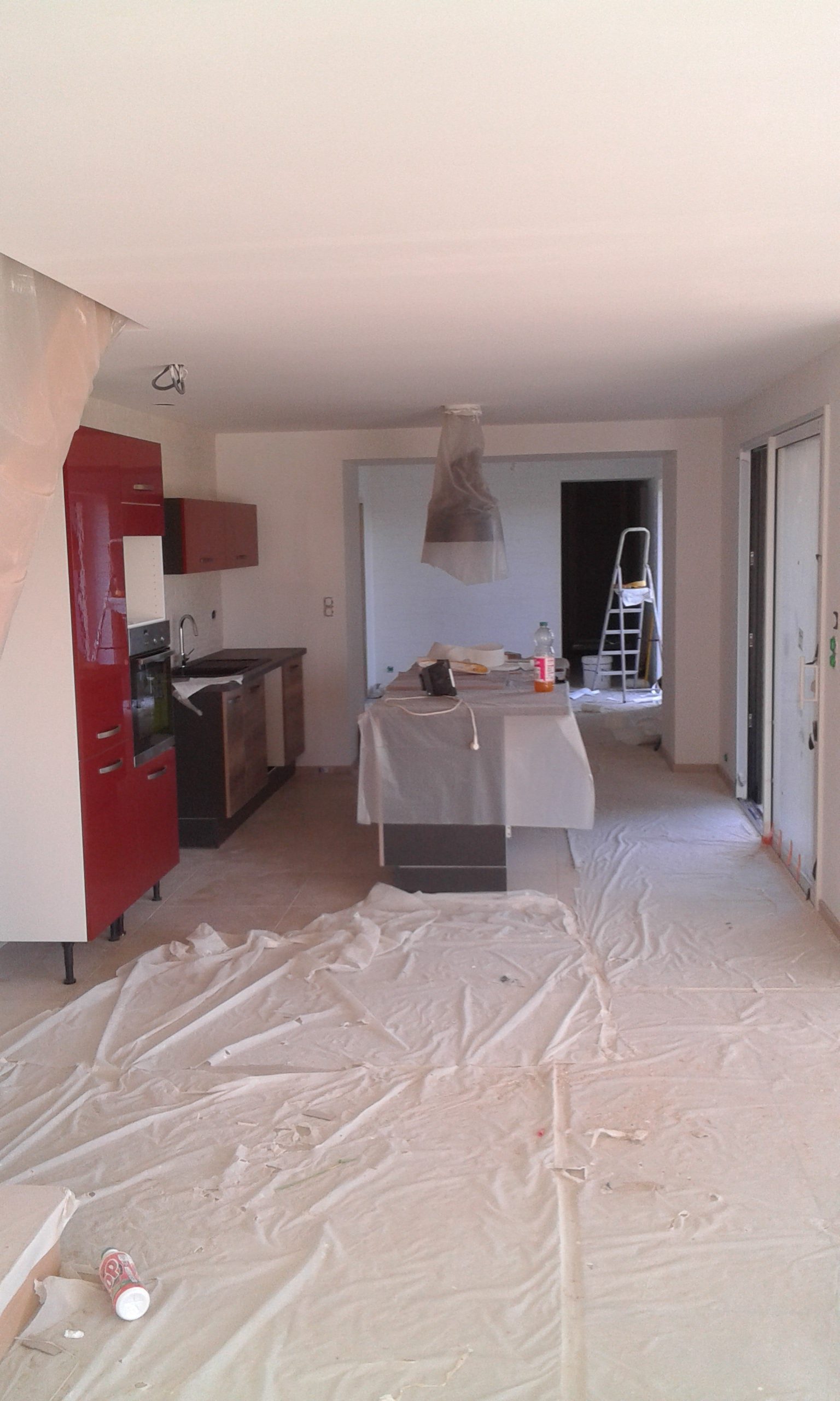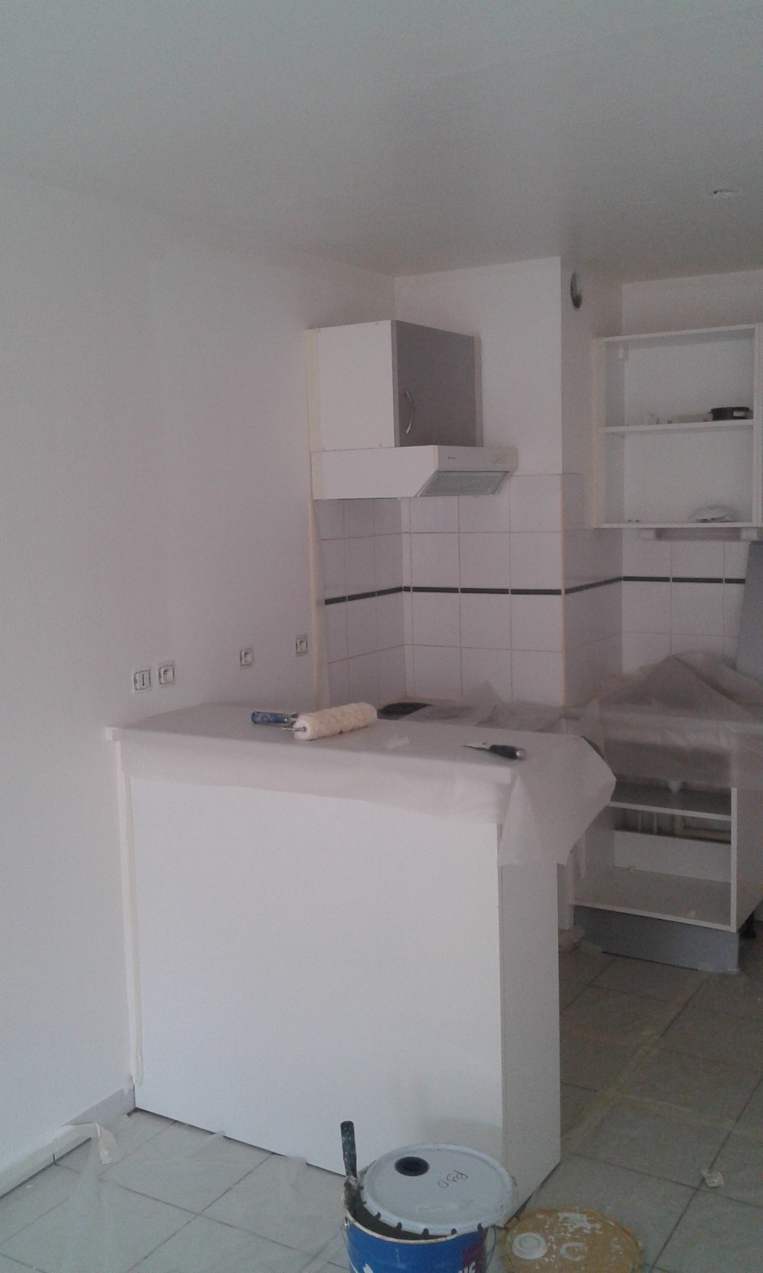 Plafond et murs de la cuisine peints après avoir protégé le sol, meubles et luminaire