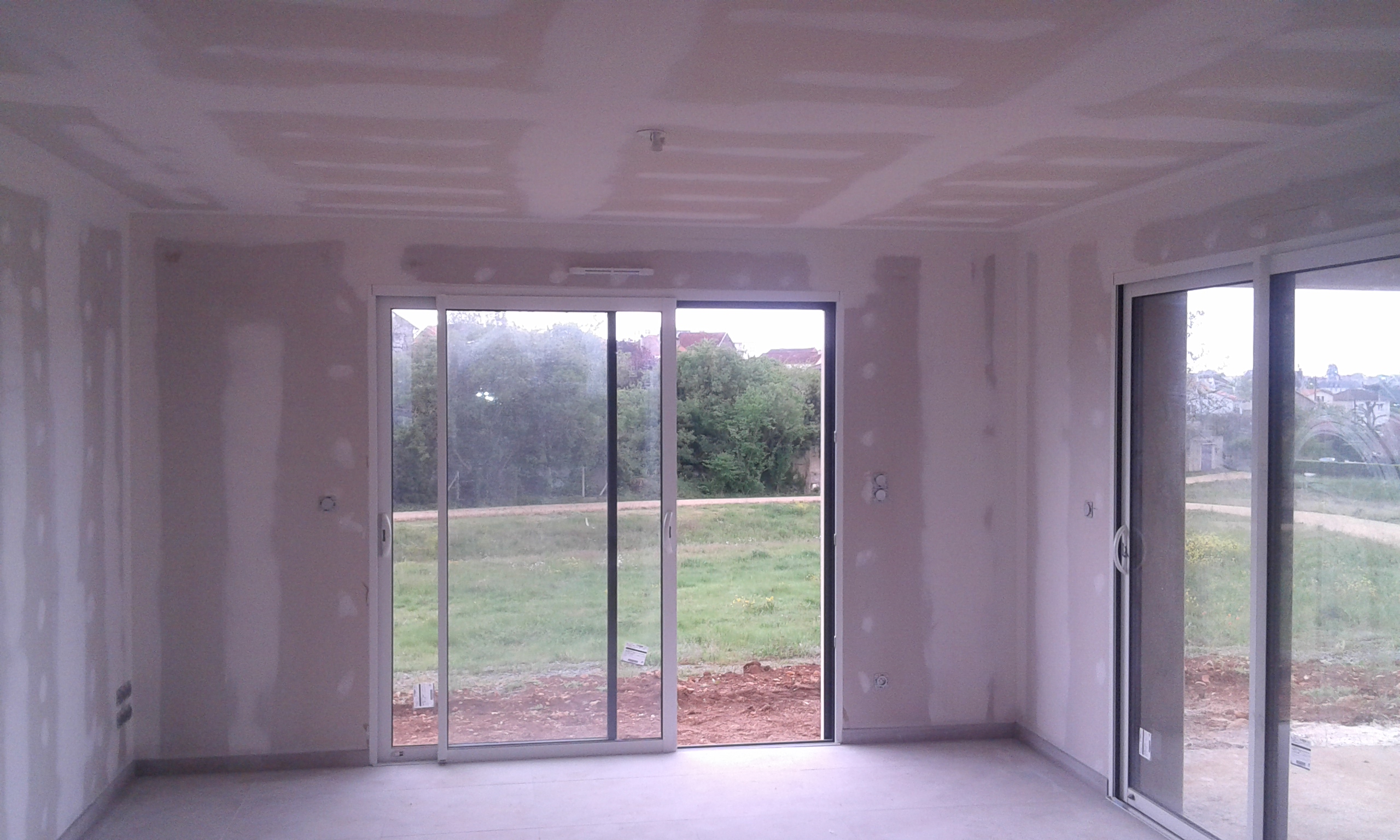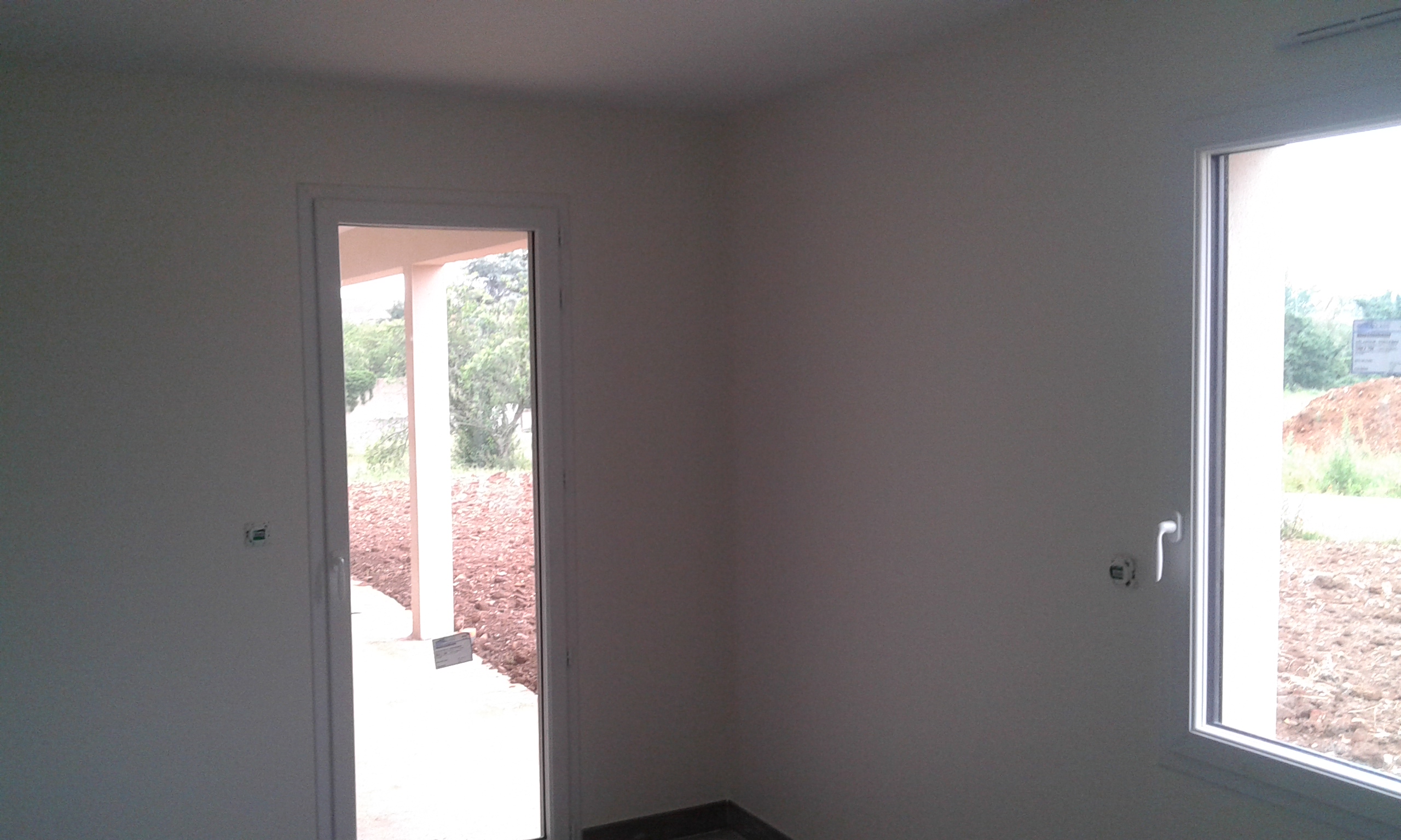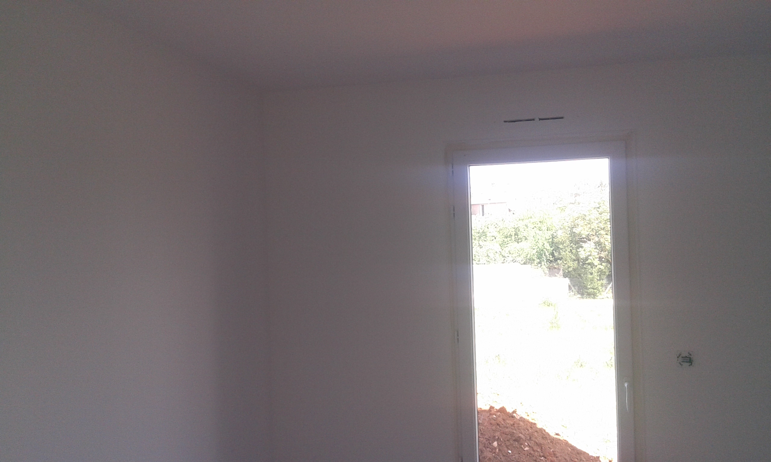 Mur et plafond peint en blanc autour d’une baie vitrée