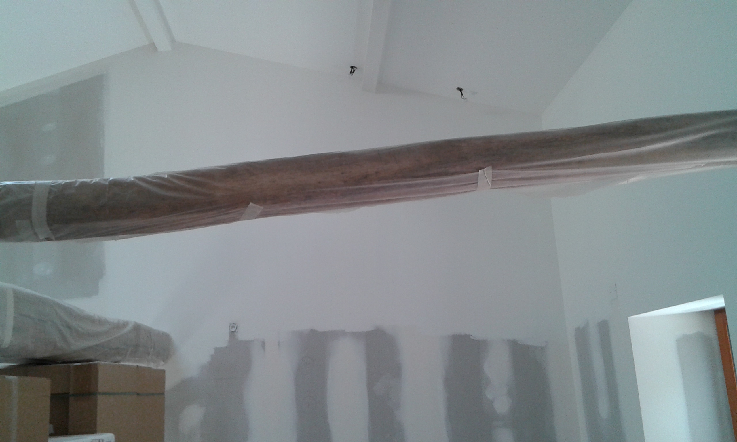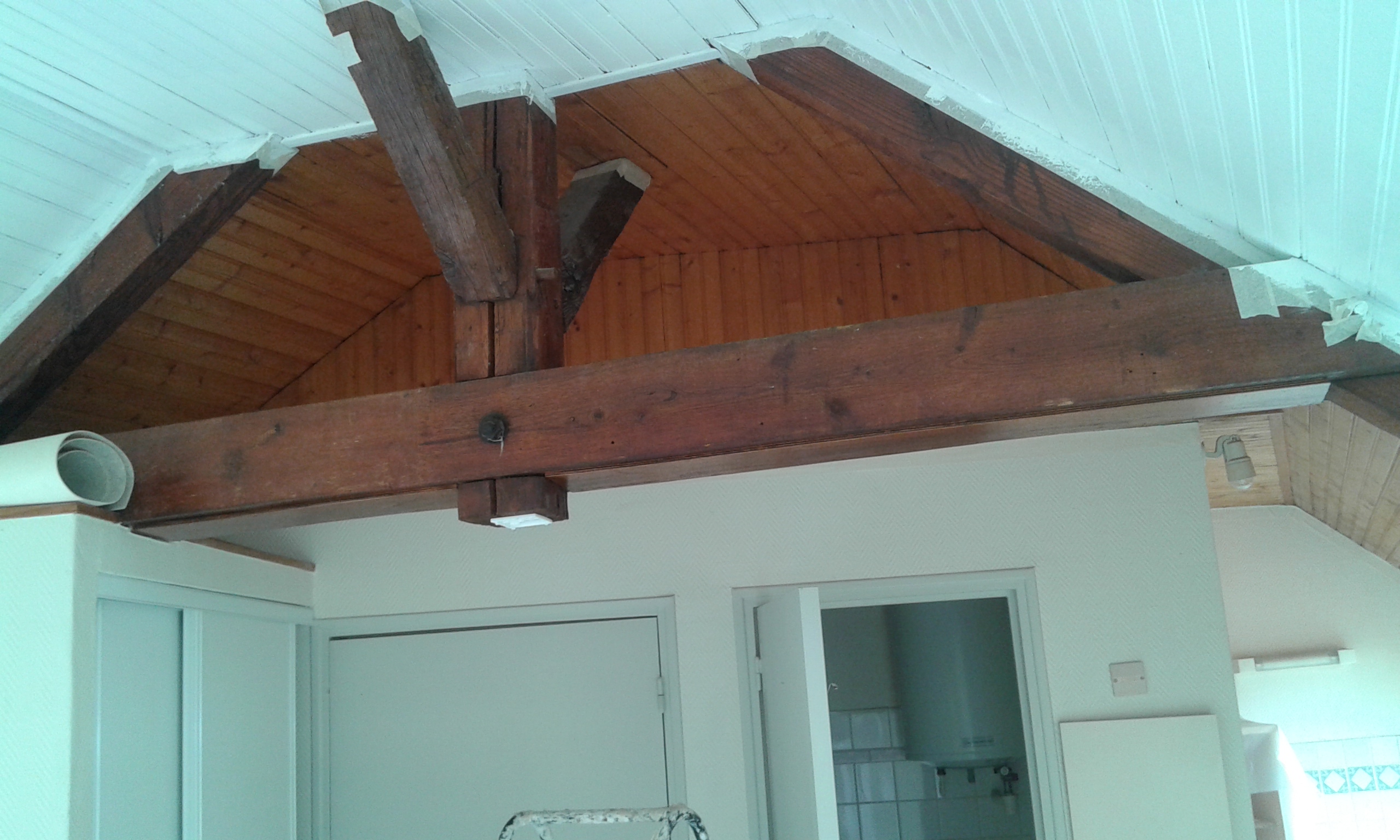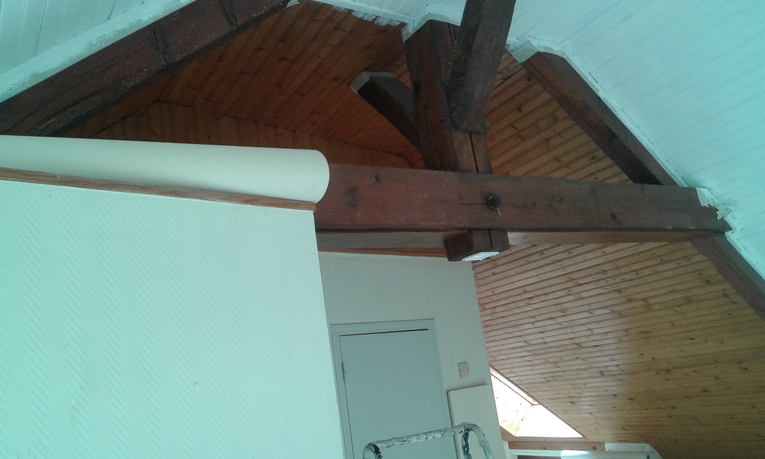Les coutours de la poutre qui sont en contact avec le lambris sont protégés avec de la bande cache