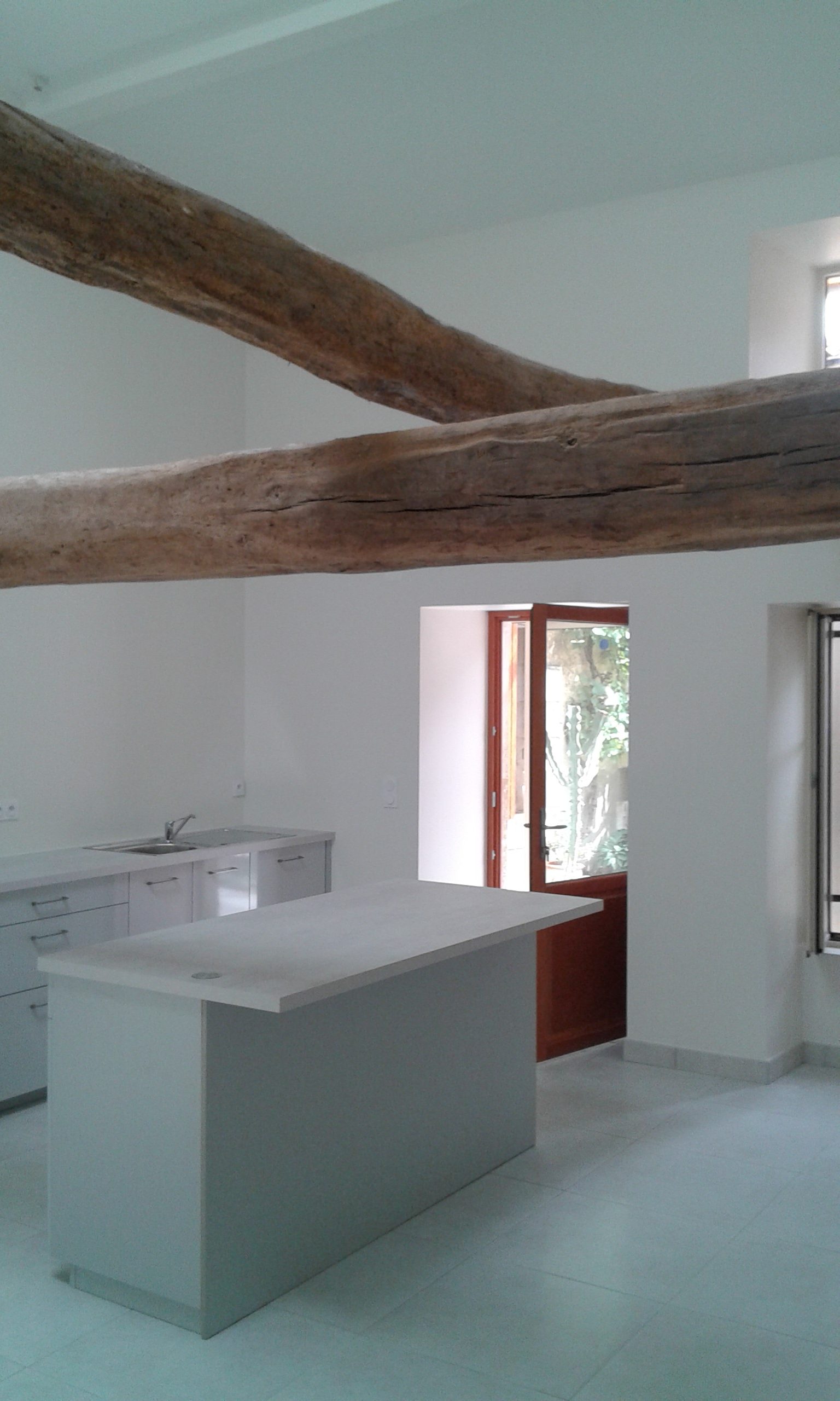 Plafond et murs peints de la cuisine avec poutres apparentes basses traversant la cuisine.