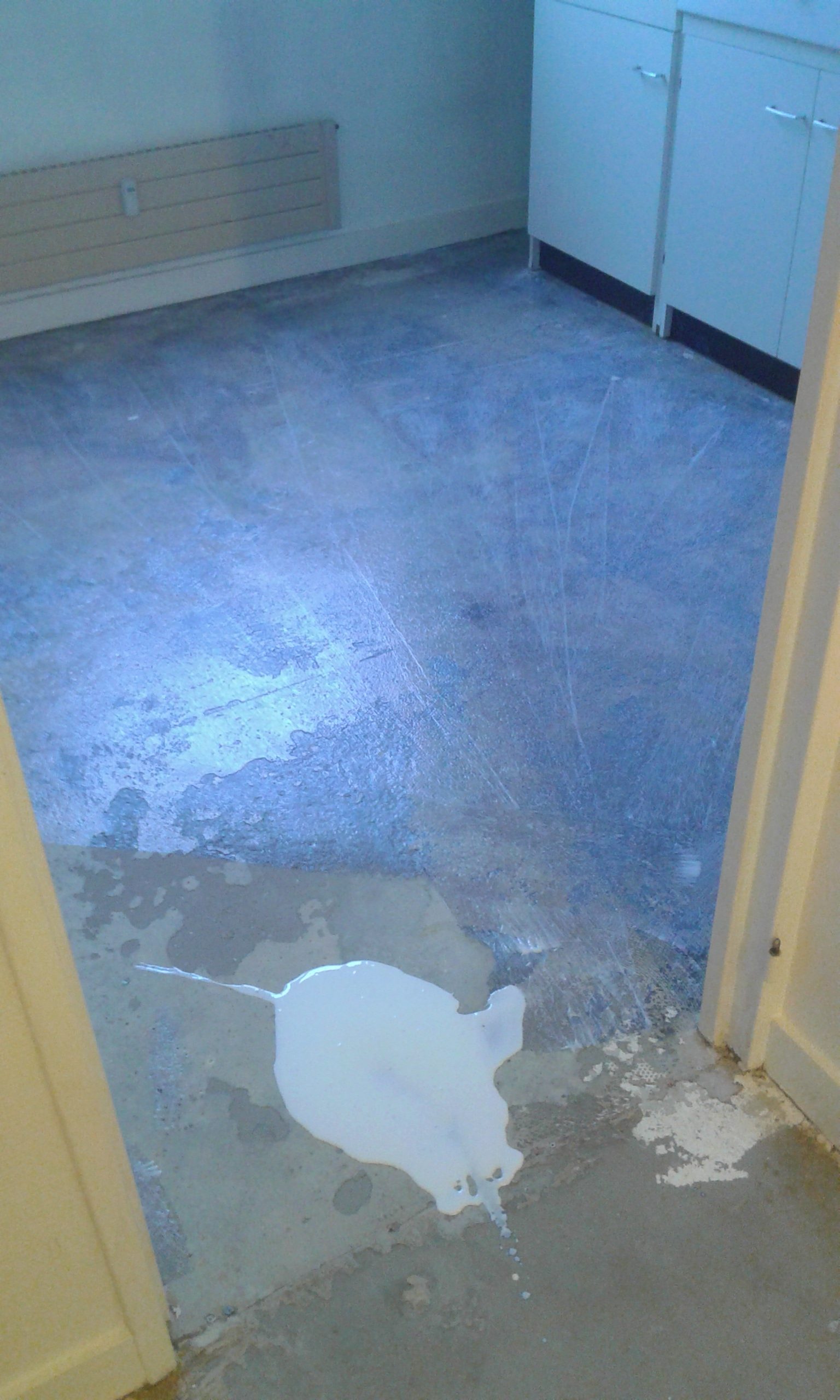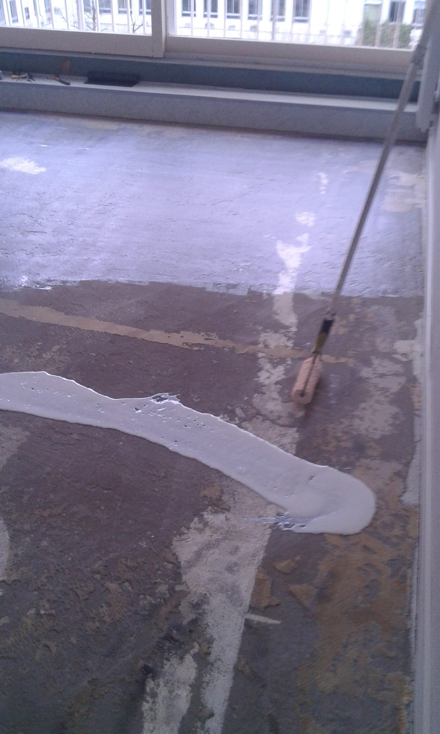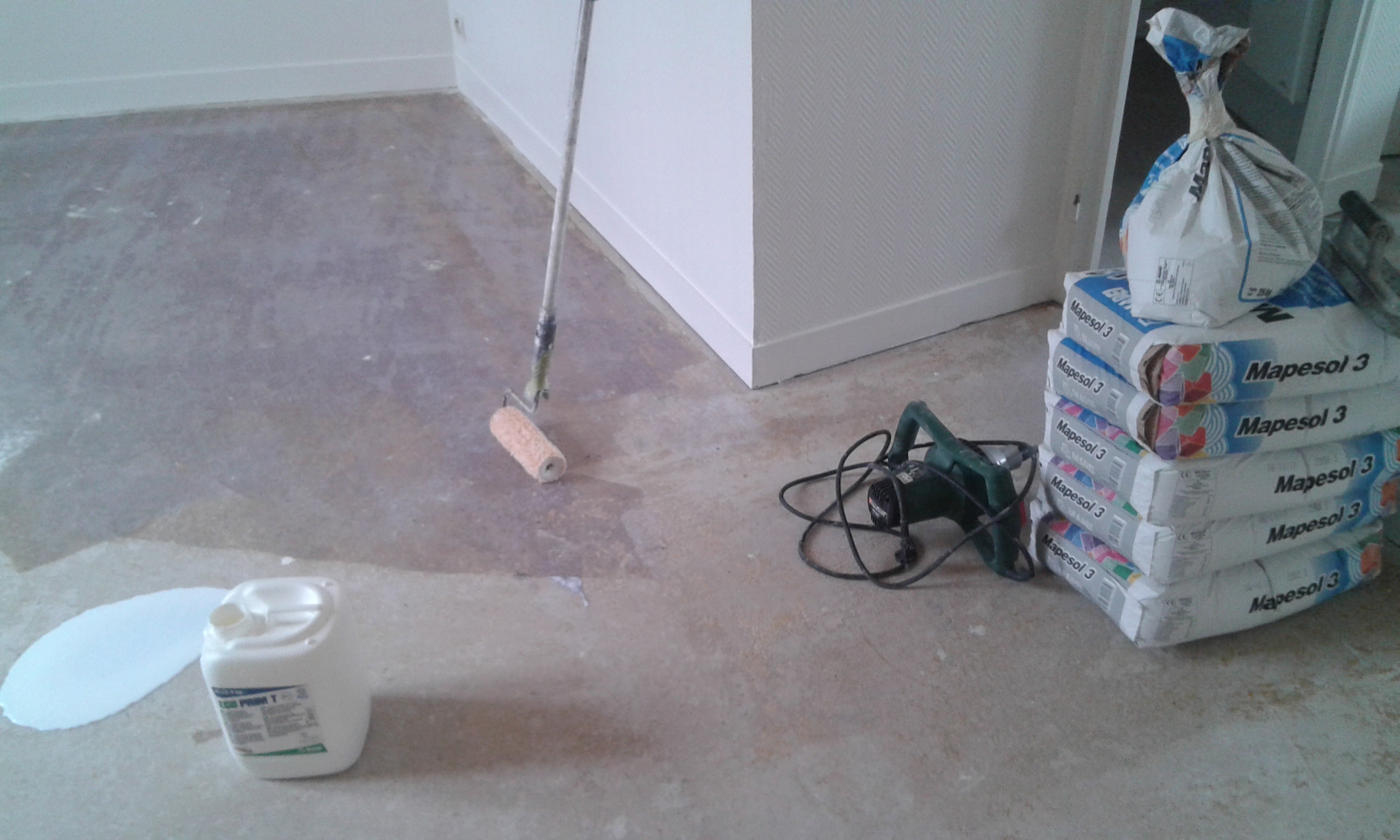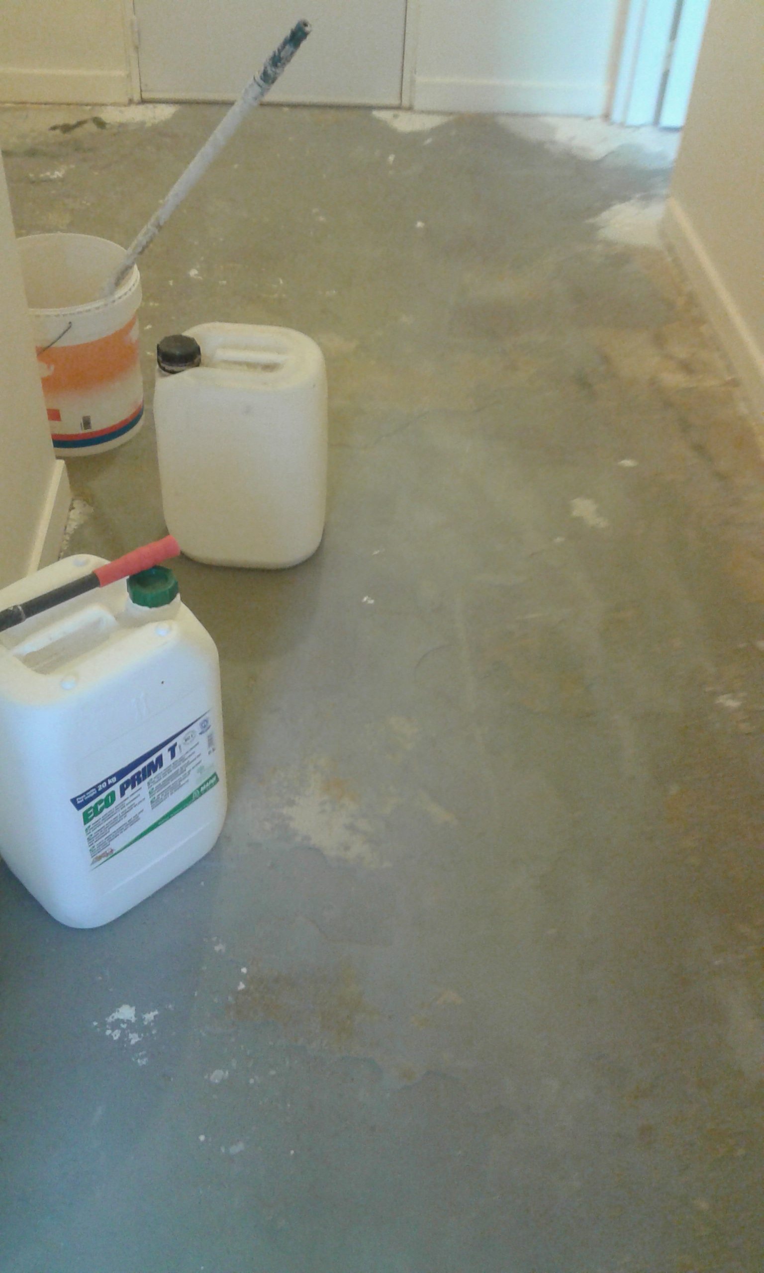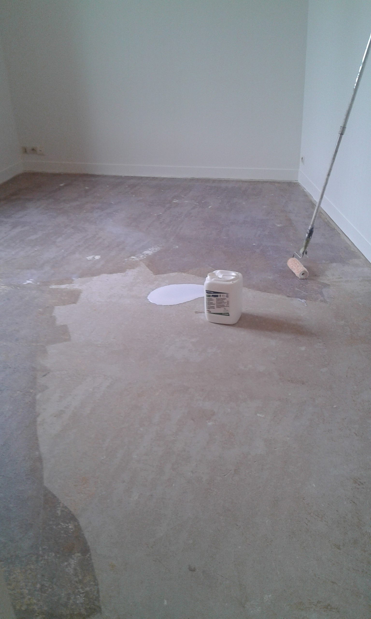 Fixateur et ré-agréage étalé et répartir sur toute la surface pour une pose du nouveau sol en pvc impeccable