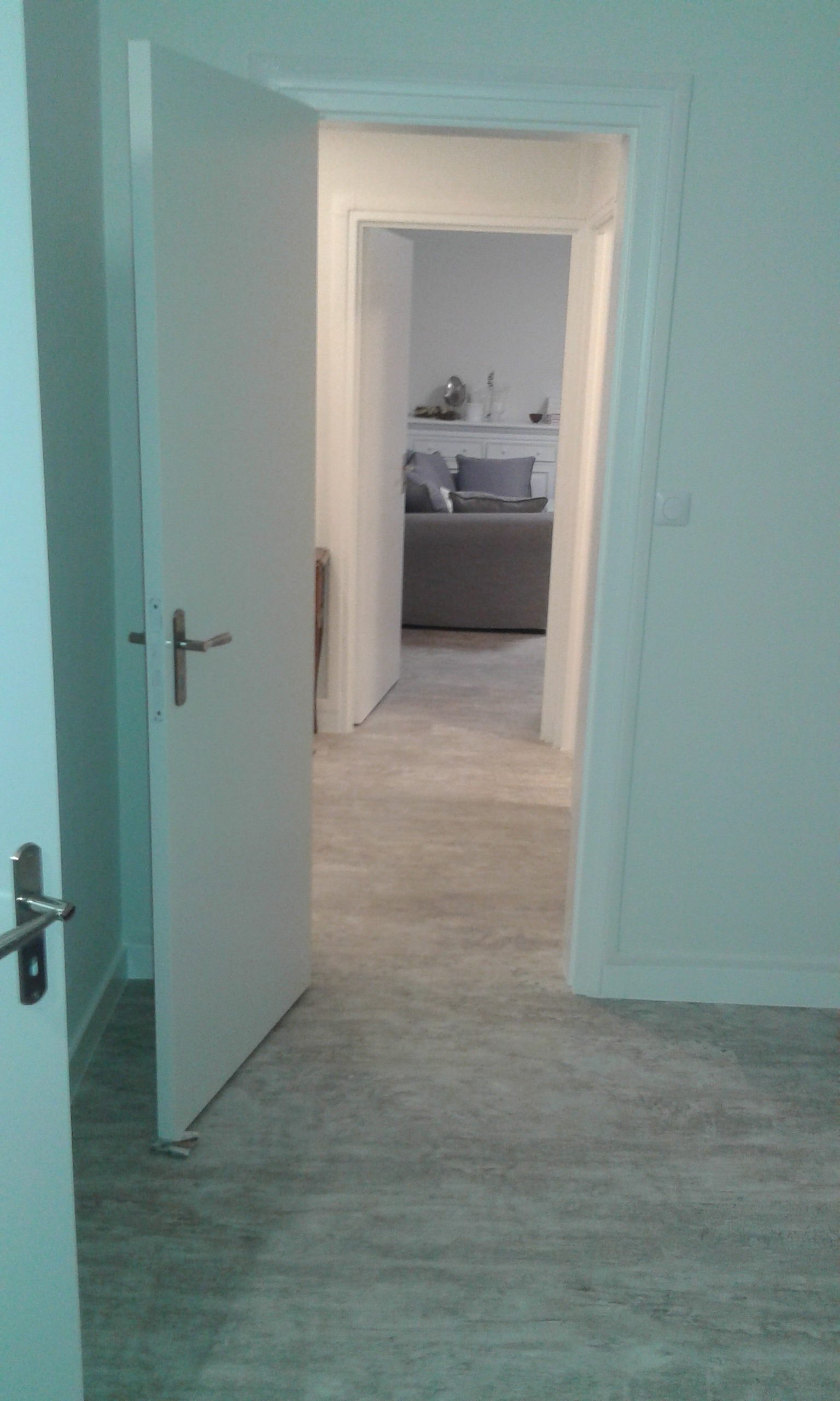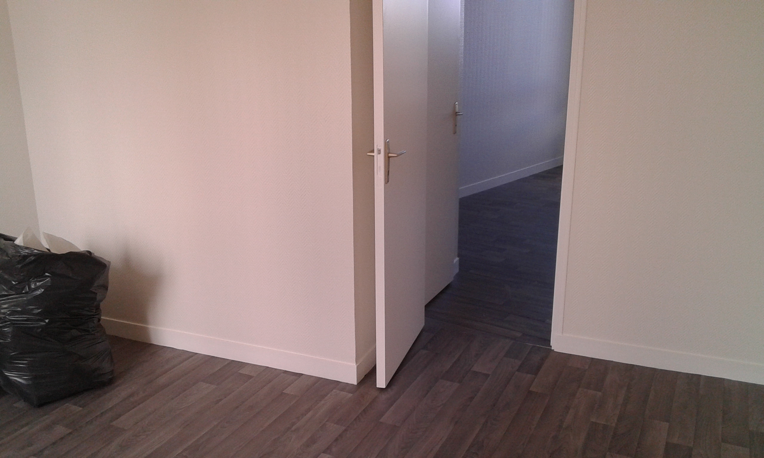 Cadre de porte repeint à l’aide d’une peinture à l’huile satin tendu. Au sol, lames de PVC imitation parquet.